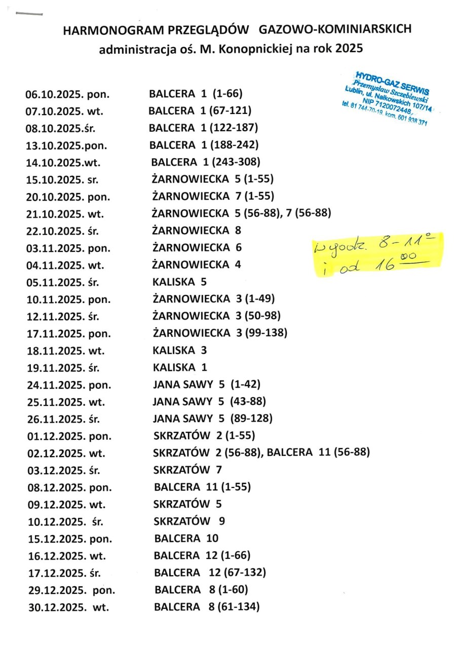 Harmonogram przeglądów gazowo-kominiarskich