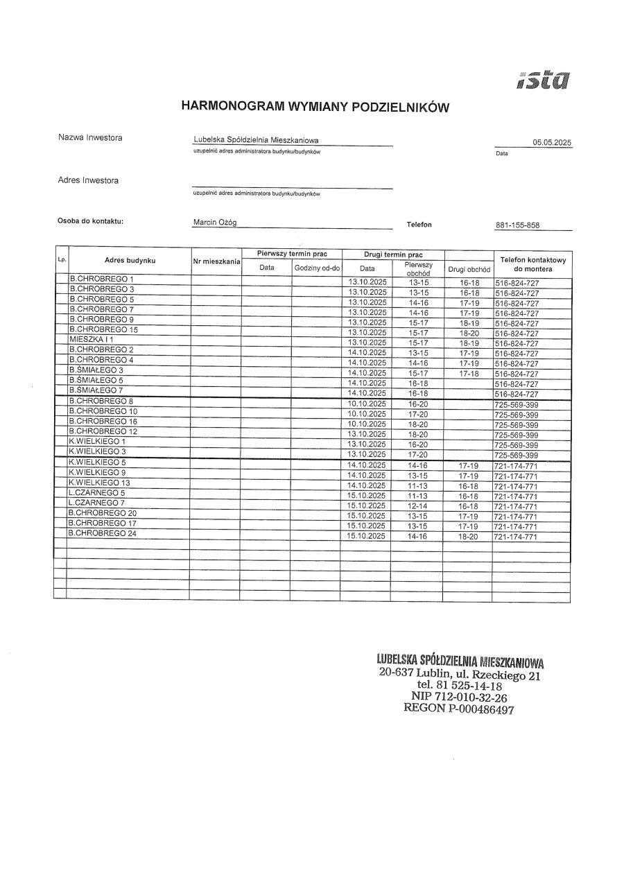 Harmonogram wymiany podzielników centralnego ogrzewania – II termin
