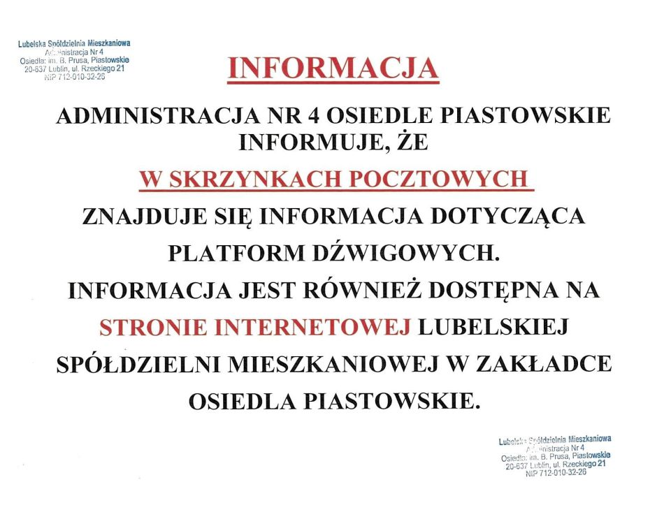 8 grudnia 2025 8 grudnia 2025 Deklaracja udziału w inwestycji dotyczącej montażu platformy w budynku przy ul. B. Śmiałego 6 w LublinieDeklaracja udziału w inwestycji dotyczącej montażu platformy w budynku przy ul. B. Śmiałego 8 w LublinieDeklaracja udziału w inwestycji dotyczącej montażu platformy w budynku przy ul. B. Śmiałego 12 w LublinieDeklaracja udziału w inwestycji dotyczącej montażu platformy w budynku przy ul. Glinianej 43 w Lublinie