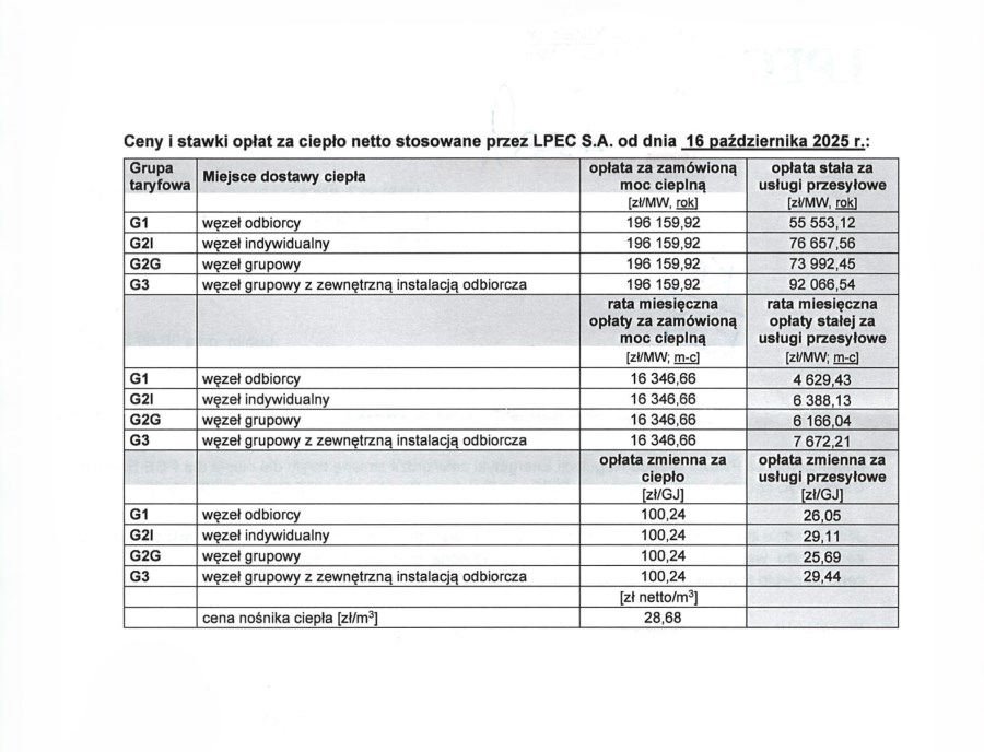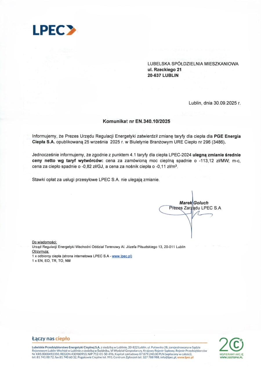 13 października 2025 13 października 2025 Poniżej zamieszczamy komunikat LPEC nr EN.340.10/2025w sprawie nowych cen ciepła obowiązującychod dnia 16 października 2025 r.