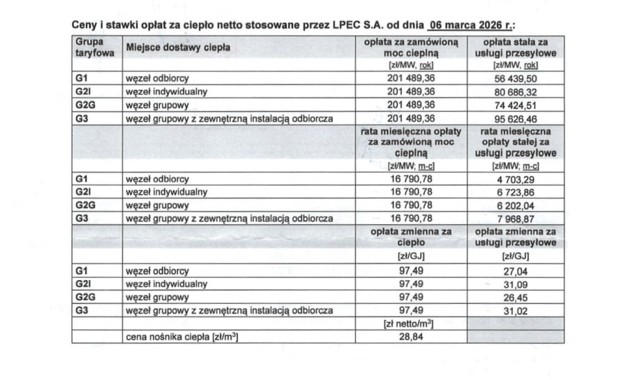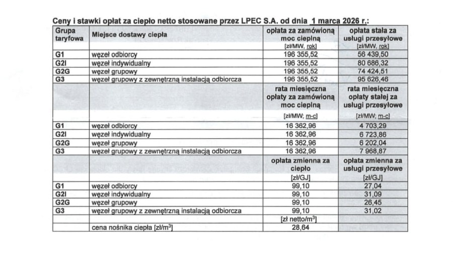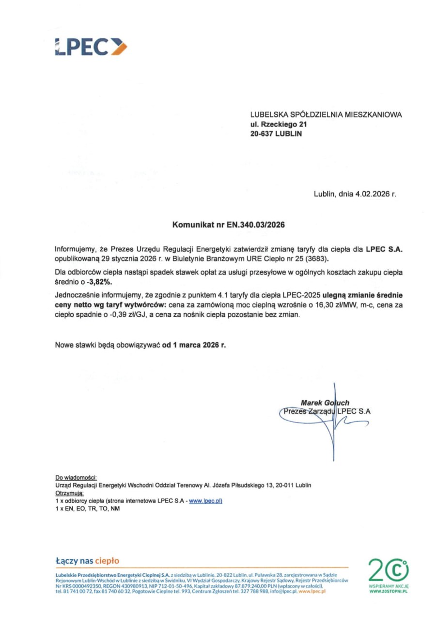 26 lutego 2026 26 lutego 2026 Poniżej zamieszczamy komunikat LPEC nr EN.340.03/2026w sprawie nowych cen ciepła obowiązującychw okresie od 1 do 5 marca 2026r. oraz komunikat nr EN.340.06/2026 z cenami obowiązującymi od dnia 6 marca 2026r.