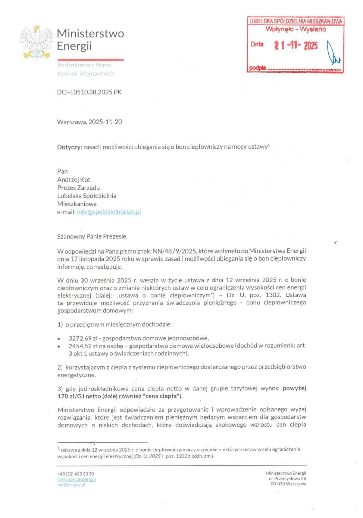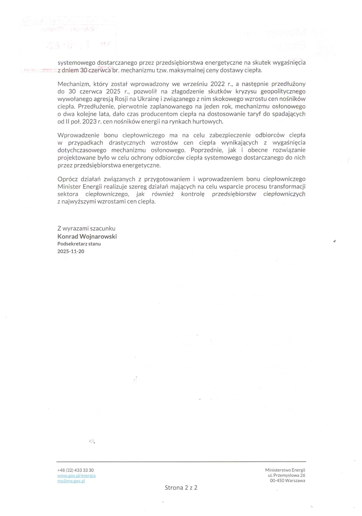 Petycja dotycząca bonu ciepłowniczego wraz z odpowiedzią z Ministerstwa Energii