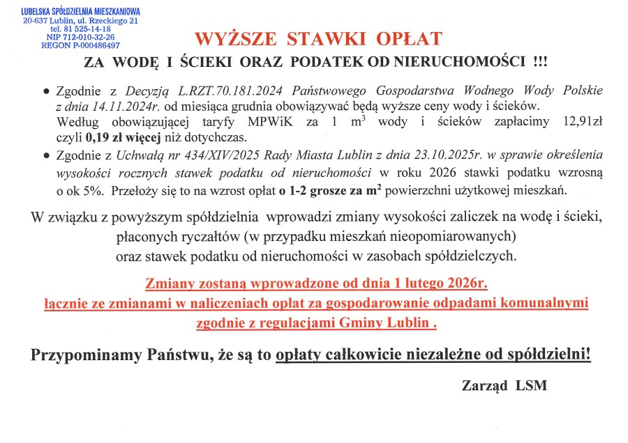 WYŻSZE STAWKI OPŁAT za wodę i ścieki oraz podatek od nieruchomości